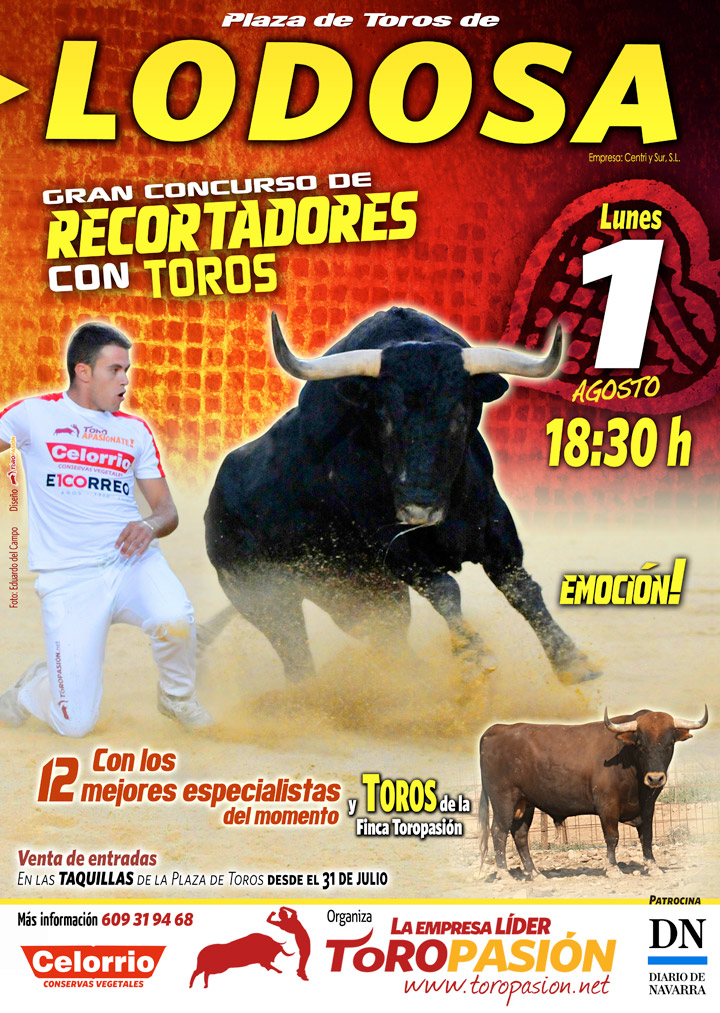 La empresa gestora de la plaza de toros de Lodosa, Centri y Sur, S.L., y con motivo de las fiestas patronales ha programado un concurso de recortadores con toros dentro del apartado taurino. Toropasión Espectáculos, S.L. Será la encargada de organizar el evento y contará con una selección de sus mejores especialistas del recorte, quiebro y salto.