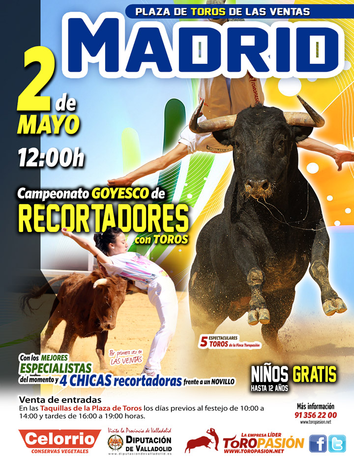 Como conmemoración del 2 de mayo la plaza de toros de Las Ventas celebrará una competición de toreo a cuerpo limpio en la modalidad goyesca. Este festejo que dará comienzo a las 12 de la mañana, contará con los mejores recortadores de las últimas temporadas. La empresa Toropasión Espectáculos, organizadora del evento, ha querido recuperar este formato en el día de la Comunidad de Madrid para promover y promocionar el arte del toreo a cuerpo limpio en la plaza de toros más importante del mundo.
