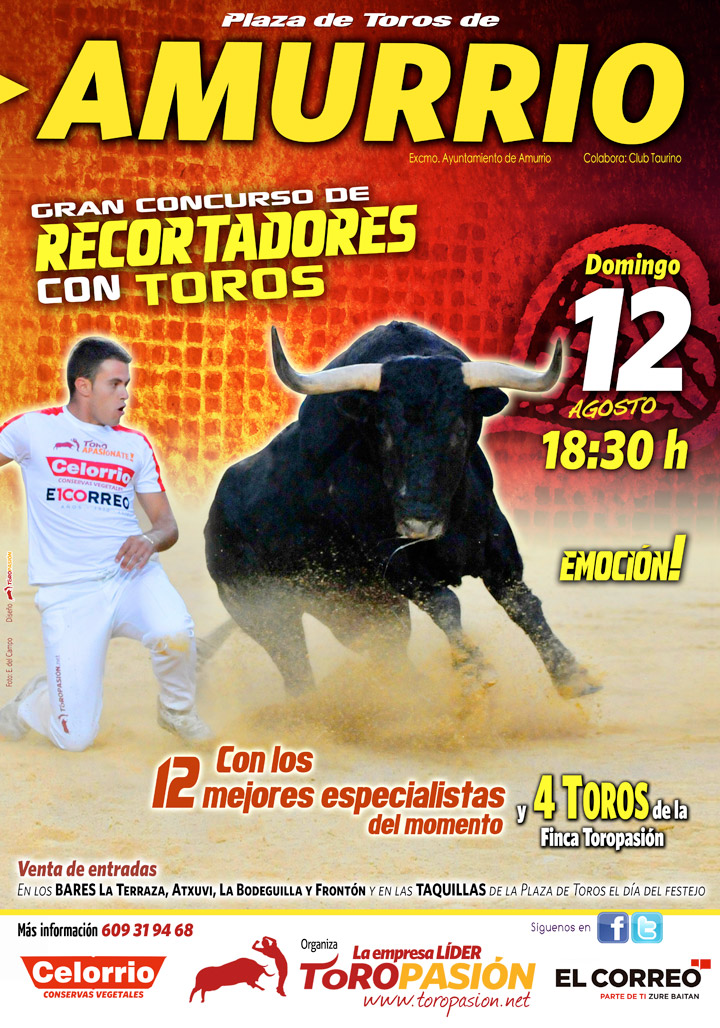 El próximo día 12 de agosto a las 18:30 horas, en la plaza de toros de Amurrio, se celebrará el esperado concurso de recortadores con toros. La empresa Toropasión Espectáculos, entidad que gestiona los concursos más importantes de la peninsula -entre ellos el de Las Ventas-, será la encargada de poner en marcha este campeonato con las máximas figuras del arte del toreo a cuerpo limpio. Será la tercera ocasión que algunos de los mejores recortadores, quebradores y saltadores de toros de la península pongan sobre el albero su arte y destreza frente a la afición vasca.