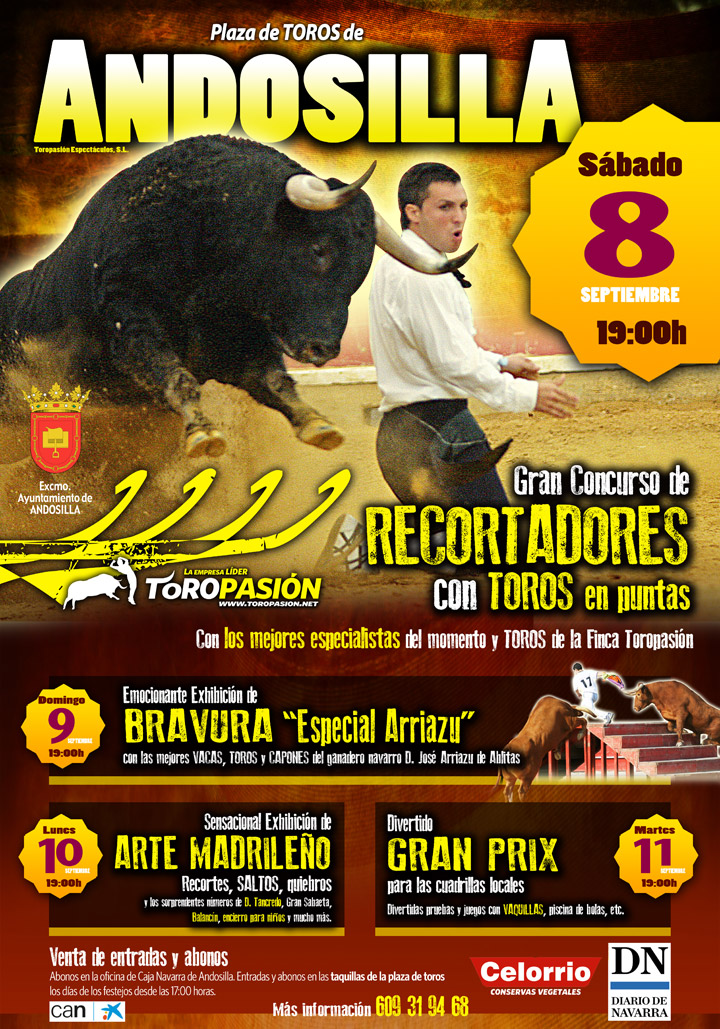 Las fiestas de Andosilla contarán, un año más, con la confianza de la empresa Toropasión Espectáculos para la gestión de su feria taurina 2012 que, en esta ocasión, contará con 4 eventos taurinos de carácter popular, entre los que destaca un concurso de recortadores con toros.