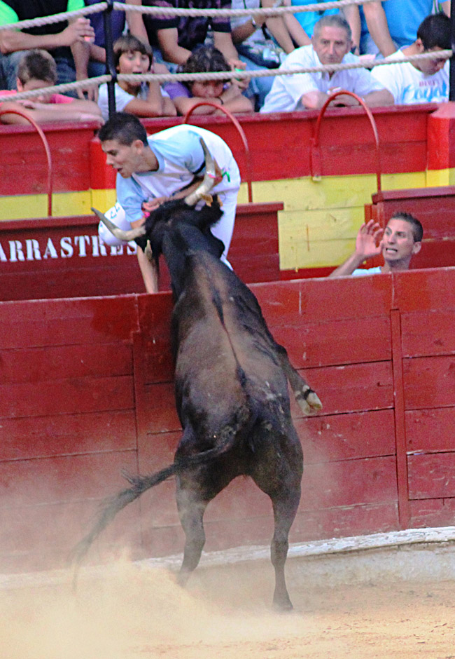 El recortador Mario González frente a una vaca de Hnos. Ozcoz. Foto: www.festejospopulares.net