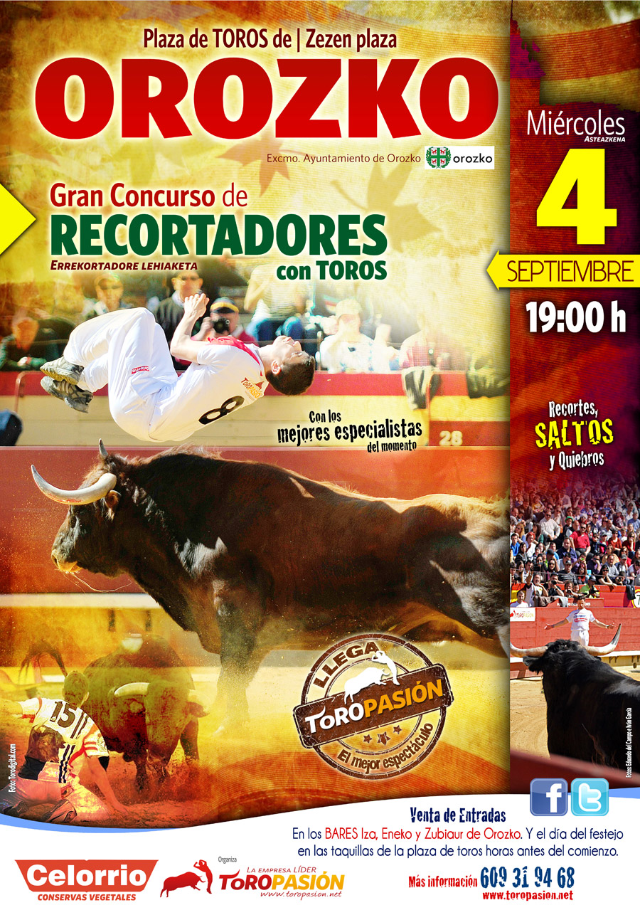 Un año más la localidad navarra de vasca de Orozko volverá a contar en su programa festivo con una competición de toreo a cuerpo limpio. En esta ocasión será la empresa Toropasión Espectáculos la encargada de poner en marcha este evento. Enmarcado en el miércoles festivo, la competición reunirá a un nutrido grupo de especialistas procedentes de distintos puntos de nuestra geografía. Las distintas suertes el toreo a cuerpo limpio, recortes, quiebros y saltos, estarán presentes en el concurso y serán evaluadas de 0 a 10 puntos por un jurado especializado.