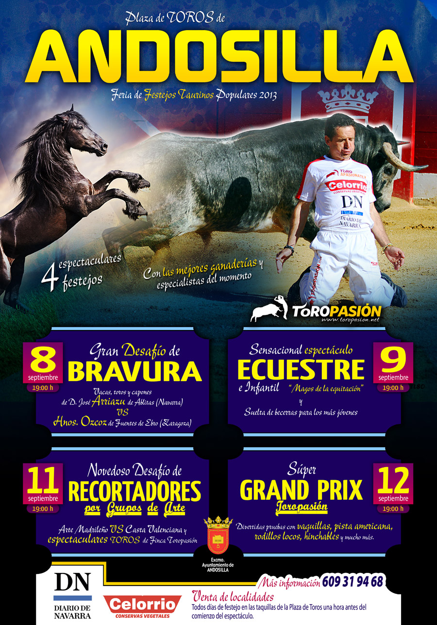 La feria taurina de Andosilla volverá a contar con la organización de Toropasión Espectáculos, S.L. que ha diseñado un ciclo compuesto por cuatro festejos que tendrán lugar del 8 al 12 de septiembre. El Excmo. Ayuntamiento de Andosilla vuelve a confiar en la empresa líder en festejos populares y apuesta por este tipo de eventos para dinamizar el programa festivo. El programa cuenta con dos novedades importantes: un espectáculo ecuestre y el desafío de grupos de Arte que contará con toros de distintas ganaderías y procedentes de Finca Toropasión.