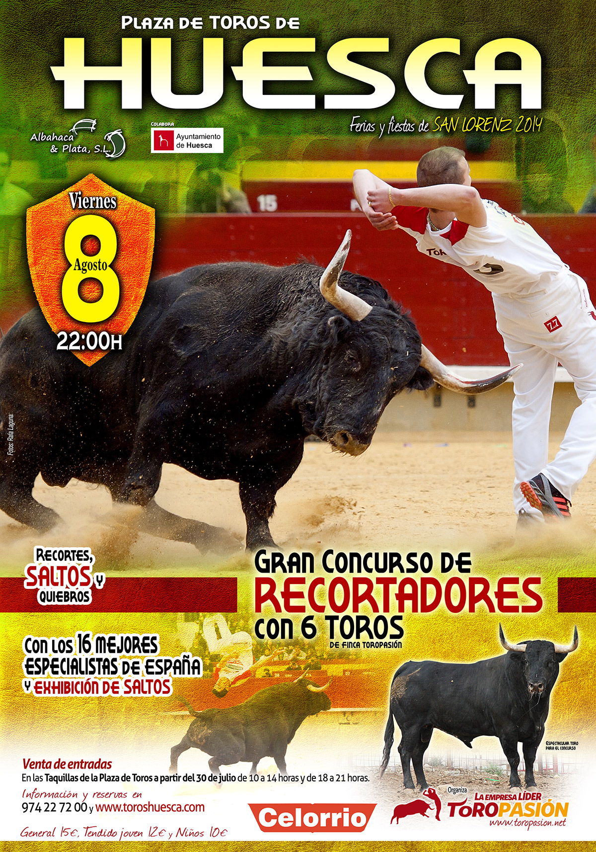 La feria taurina de San Lorenzo, que tendrá lugar en la plaza de toros de Huesca del 8 al 13 de agosto, volverá a contar con la tauromaquia a cuerpo limpio de Toropasión. La empresa gestora de la plaza, Albahaca y Plata, S.L., ha vuelto a confiar en la empresa riojana Toropasión pata el diseño del concurso de recortadores. Un festejo que contará con algunas de las figuras más importantes del toreo a cuerpo limpio y con 6 espectaculares toros de distintas ganaderías.