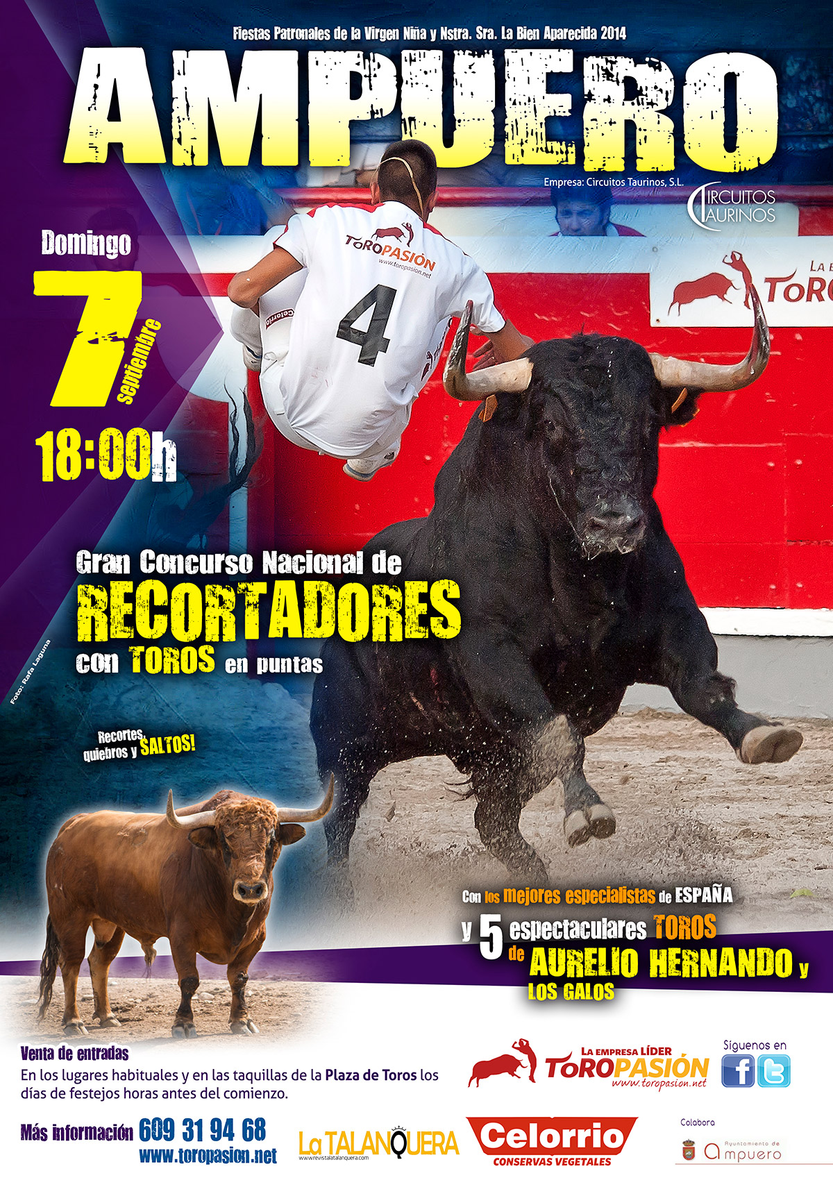 La localidad cántabra de Ampuero, famosa por sus tradicionales encierros, contará nuevamente con la experiencia de Toropasión para la confección y el diseño del concurso nacional de recortadores que, desde hace unos años, se viene celebrando en esta preciosa villa. La empresa Circuitos Taurinos, gestora de la plaza, pondrá en marcha un certamen de recortadores que se celebrará el domingo 7 de septiembre a las 18:00 horas y que contará con los máximos exponentes de la tauromaquia a cuerpo limpio.