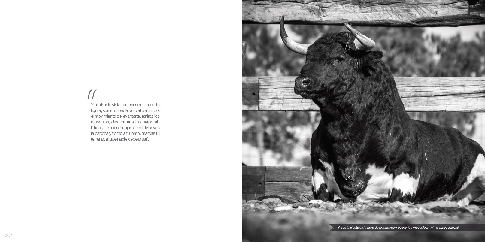 Este libro, disponible en formato impreso (18€) y digital (6,90€), es obra de Carlos Bernabé y cuenta con la colaboración de los aficionados a la fotografía Eduardo del Campo, Eva Sánchez y Carmen Meroño, que cuentan con un buen número de adeptos en sus redes sociales en las que diariamente muestran su pasión al toro bravo. La obra muestra mediante fotografías y textos el lado más íntimo y salvaje del toro de lidia, un animal que se quiera o no es parte de nuestra cultura, seña de identidad y fuente de valores de incalculable riqueza. Desde un bello amanecer, pasando por las faenas camperas, los comportamientos del toro de lidia, su hábitat e incluso su lucha -de poder a poder- en el campo y la plaza, son algunas de las escenas recogidas en esta eclosión de pura bravura.