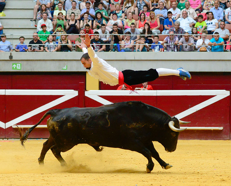 El logroñés Sergio Urruticoechea realizando un salto del ángel ante un espectacular toro. Foto: Eduardo del Campo.