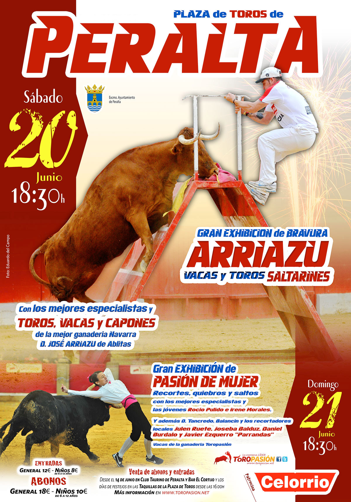 La tarde del domingo 21 de junio, 18:30 horas, estará dedicada a la tauromaquia a cuerpo limpio. Ante vacas de la ganadería Toropasión, algunos de los recortadores más en forma del año realizarán recortes, quiebros y saltos, así como otros números como el balancín o el D. Tancredo. Las chicas Irene Morales y Rocío Pulido actuarán en este evento y llevarán a cabo diferentes suertes frente a las reses. Pasión de Mujer es el grupo formado por estas dos jóvenes que han asombrado a muchos aficionados con su valor y tesón frente a los astados. Para Irene este festejo supondrá su debut en la plaza de Peralta, mientras que Rocío ya lo hizo en 2013 con una actuación memorable.