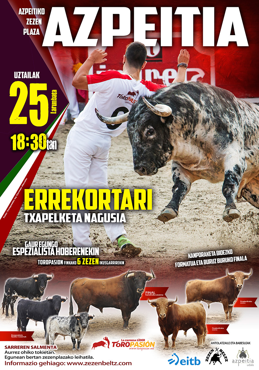 La feria de Azpeitia volverá a contar con la colaboración de la empresa líder Toropasión que, junto a Zezen Beltz, ha diseñado un atractivo concurso que captará la atención de los aficionados. La tarde del sábado 25 de julio, a las 18:30 horas, tendrá lugar un concurso de recortadores en el que los 12 mejores especialistas del momento realizarán una demostración de valor, arte y pureza frente a 6 espectaculares toros. Los concursos de recortadores generan mucha expectación y han ofrecido momento muy vibrantes en los últimos años en la plaza de toros de Azpeitia que llena sus gradas para hacer realidad la danza del mejor toreo a cuerpo limpio.