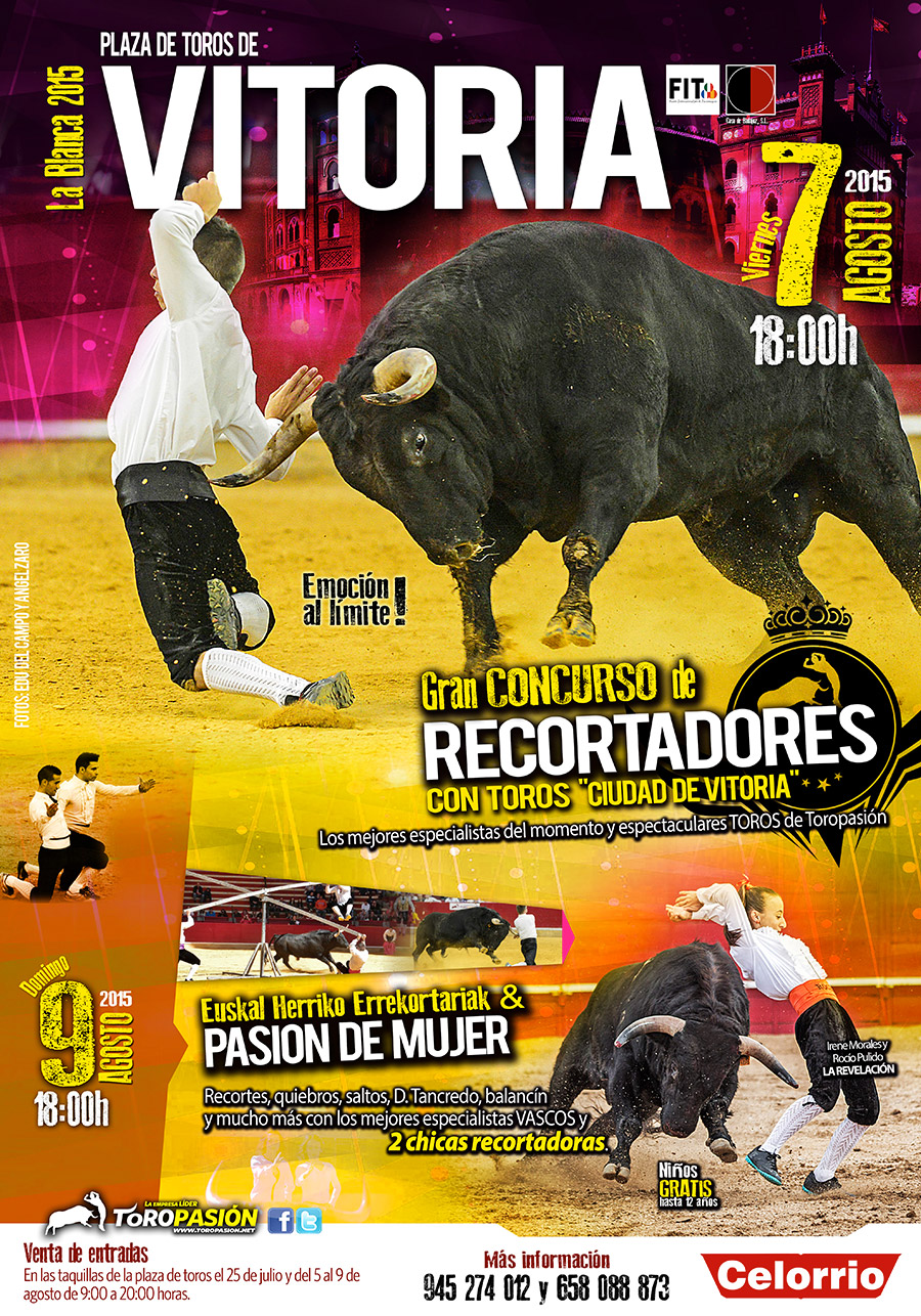 A las 18:00 horas del viernes 7 de agosto dará comienzo el concurso de recortadores con toros que la empresa Toropasión Espectáculos junto con Coso de Badajoz van a poner en marcha con motivo de las fiestas de La Blanca. Toropasión, empresa líder en festejos taurinos populares, trasladará a Vitoria a sus mejores especialistas del toreo a cuerpo limpio. Un nutrido y variado elenco de jóvenes de las suertes del recorte, quiebro y salto.