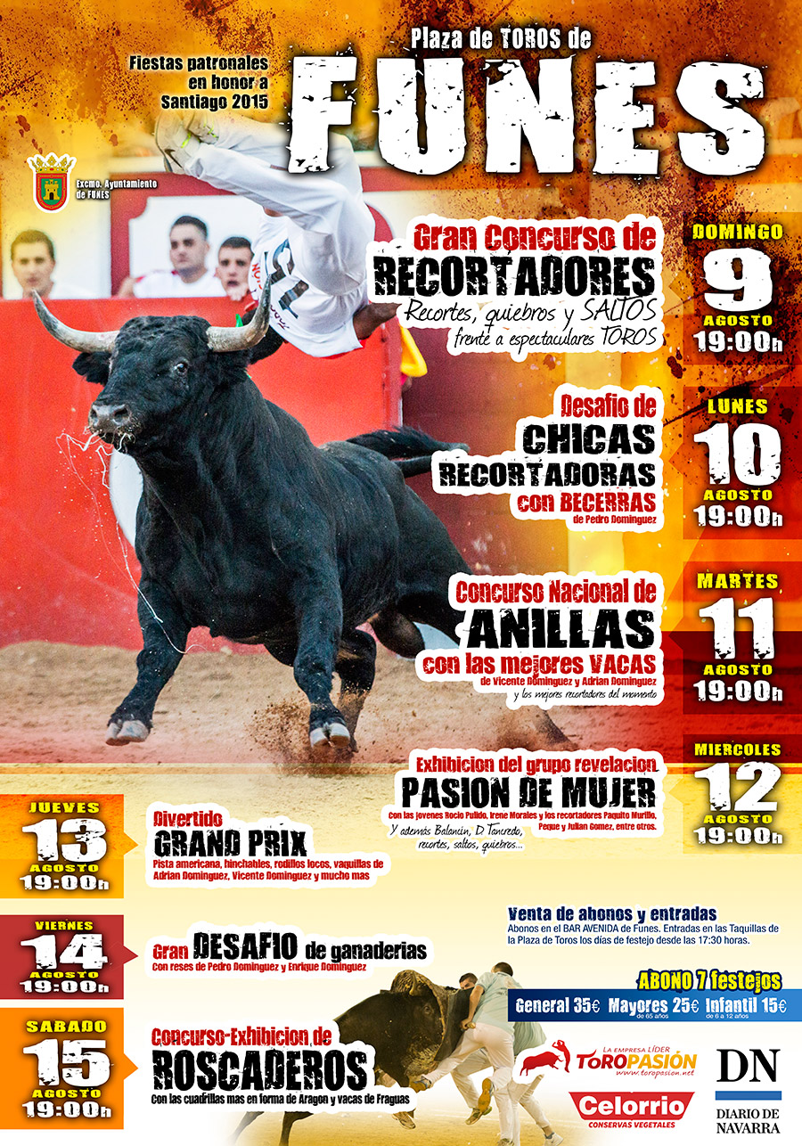 Los abonos pueden adquirirse en el Bar Avenida de Funes. Las entradas en las taquillas de la plaza de toros los días de los festejos desde las 17:30 horas.