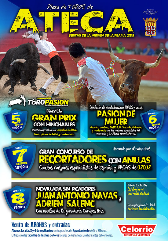 La empresa riojana líder en festejos taurios populares, Toropasión, será la encargada del diseño y puesta en marcha de la feria taurina de la localidad zaragozana de Ateca. El consistorio maño ha confiado en Toropasión la organización de un ciclo que contará como platos fuertes con un concurso de recortadores con anillas y las mejores vacas de Hnos. Ozcoz (lunes 7 de septiembre), así como una novillada sin picadores (martes 8 de septiembre) para los novilleros Juan Antonio Navas y Adrien Salenc. Además de estos espectáculos abrirá la feria el gran prix popular el sábado 5 de septiembre con las cuadrillas de la localidad y divertidas pruebas con vaquillas. El domingo 6 de septiembre será el turno del debut del grupo Pasión de Mujer, formado por los mejores recortadores nacionales, entre ellos las jóvenes Rocío Pulido e Irene Morales.