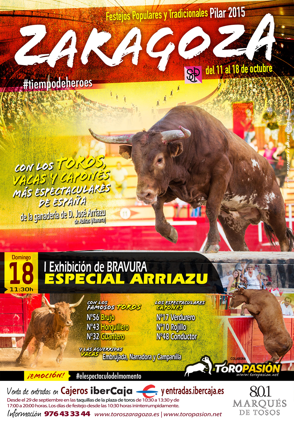 La feria de festejos taurinos del Pilar 2015 se cerrará con un espectáculo que es una garantía de éxito en todos los lugares en los que se celebra, el especial de bravura con obstáculos de la ganadería D. José Arriazu. Este festejo que destaca por la constante emoción que se vive en la plaza, será la guinda de un ciclo que terminará en la mañana del domingo 18 de octubre (11:30 horas).
