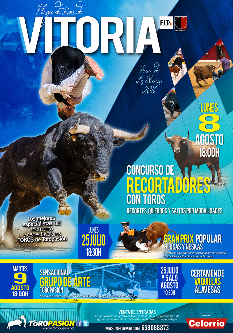 Las fiestas de La Blanca volverán a contar con la tauromaquia a cuerpo limpio de Toropasión, empresa líder en festejos taurinos populares, que trasladará a Vitoria a sus mejores especialistas. La tarde del lunes 8 de agosto, a las 18:00 horas, será el turno de los mejores recortadores de toros del mundo que se enfrentarán en un formato de competición por modalidades. Recortadores, quebradores y saltadores de primer nivel llevarán la emoción a los tendidos del Iradier Arena para deleitar a los presentes con suertes increíbles como volar por encima de los toros, dejar que los pitones deslicen sobre su espalda o burlar la embestida de los astados con un simple movimiento del cuerpo.