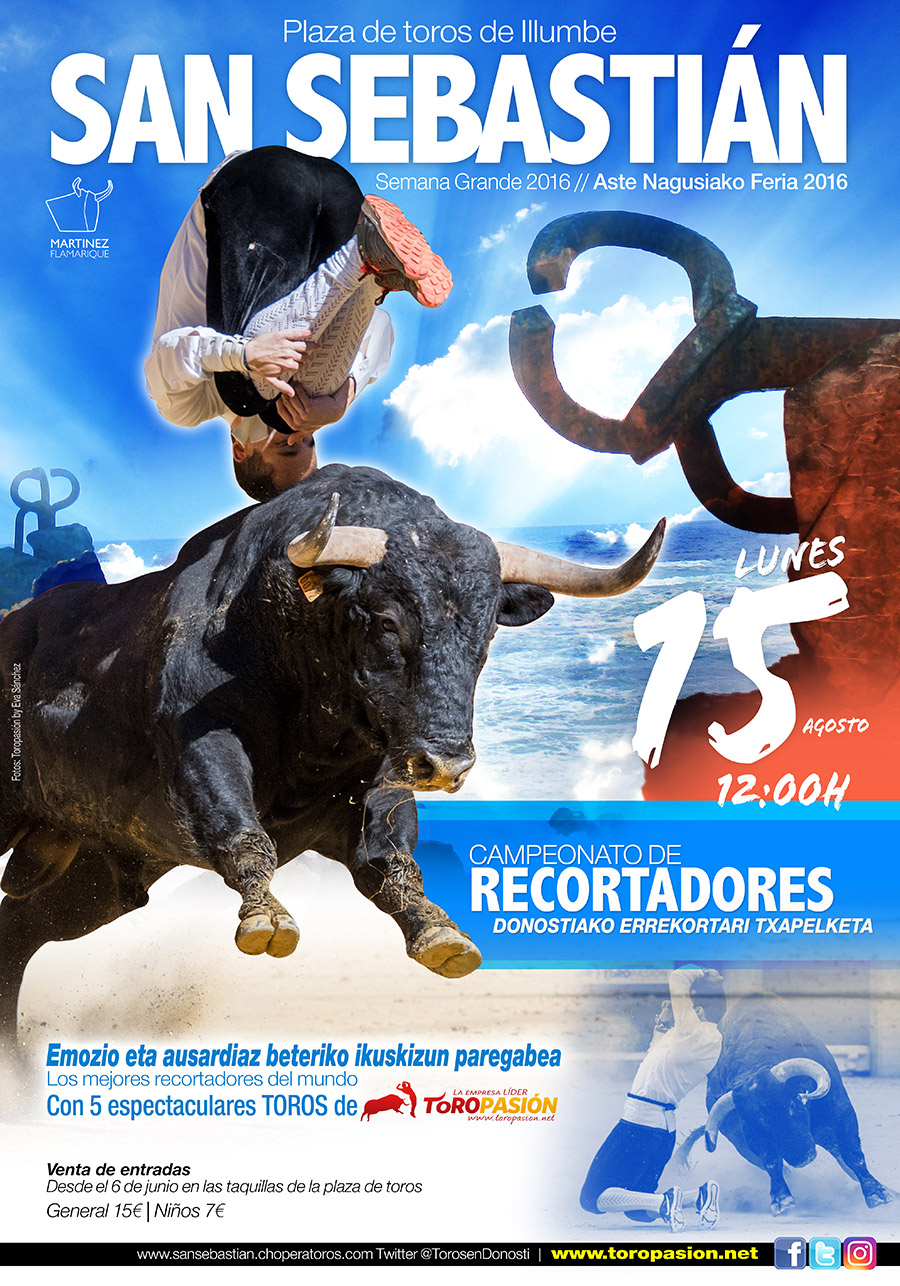 Por segundo año consecutivo regresa a San Sebastián la tauromaquia de la emoción y el riesgo, la tauromaquia a cuerpo limpio más espectacular, la tauromaquia de Toropasión. En la mañana del lunes 15 de agosto, 12:00 horas, los mejores especialistas del mundo del recorte, quiebro y salto pisarán el albero donostiarra para deleitar al público con sus asombrosas suertes. El concurso de recortadores, tras el éxito, del año pasado volverá a emocionar a los aficionados y a congregar a los mejores exponentes del momento con la destacada presencia de las figuras del escalafón.
