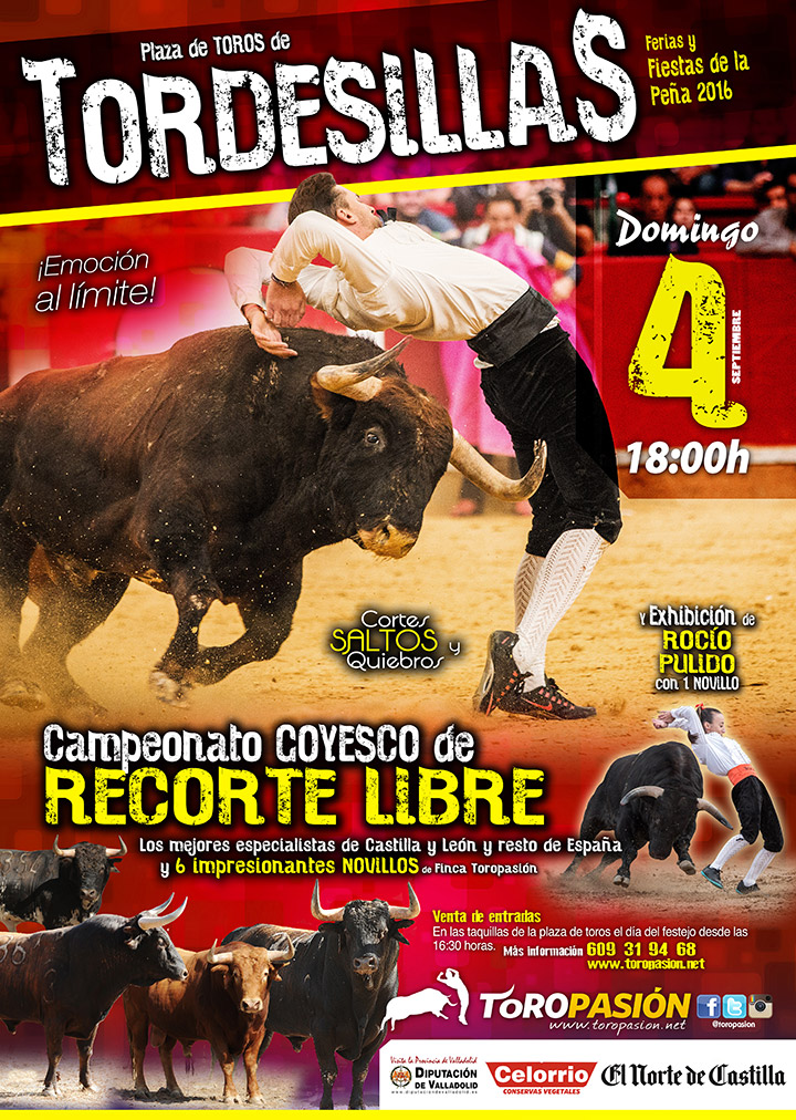 Las fiestas de la Virgen de la Peña darán comienzo y sus festejos taurinos volverán a ser el epicentro de la programación festiva. La empresa Toropasión junto al Ayuntamiento de Tordesillas volverán a apostar, el domingo 4 de septiembre a las 18:00 horas, por la tauromaquia a cuerpo limpio dentro de su feria taurina. Tras el éxito de años pasados y manteniendo las mismas bases, Toropasión pondrá en marcha un evento que contará con los mejores cortadores, quebradores y saltadores del momento. Con indumentaria goyesca, saltarán al ruedo los máximos exponentes de la tauromaquia a cuerpo limpio, la tauromaquia de la emoción y la pasión.