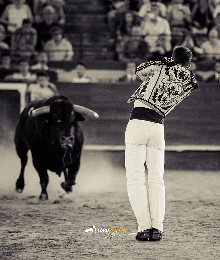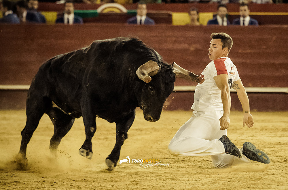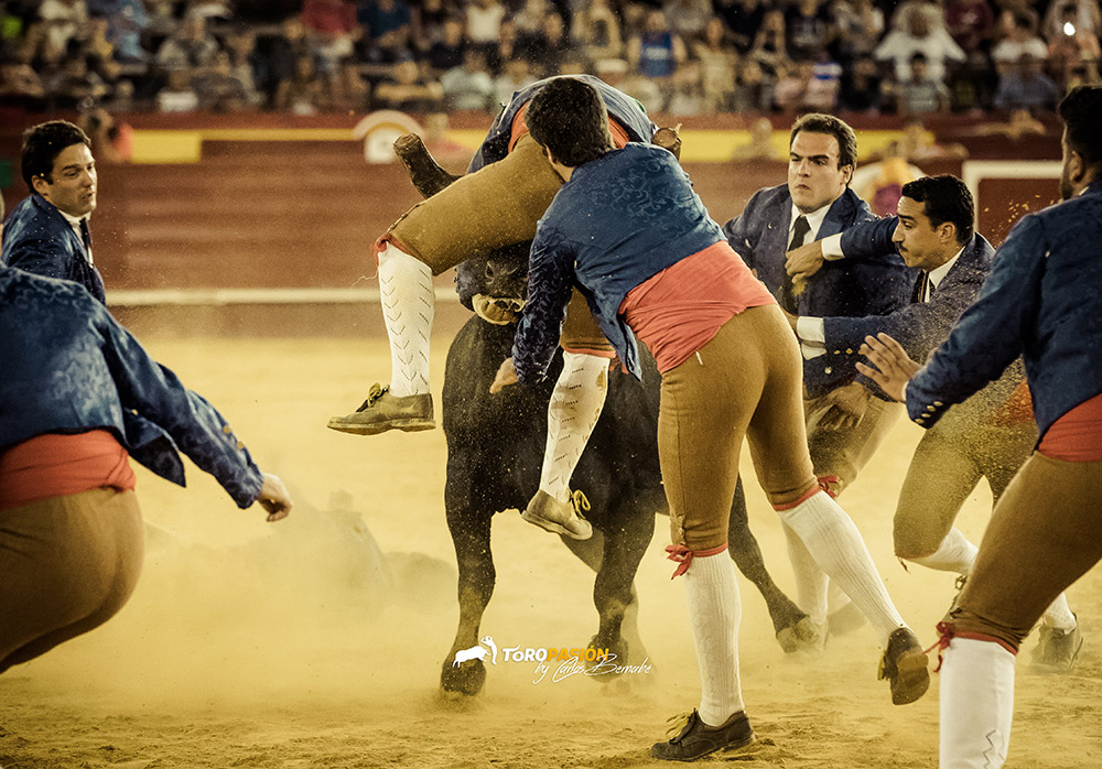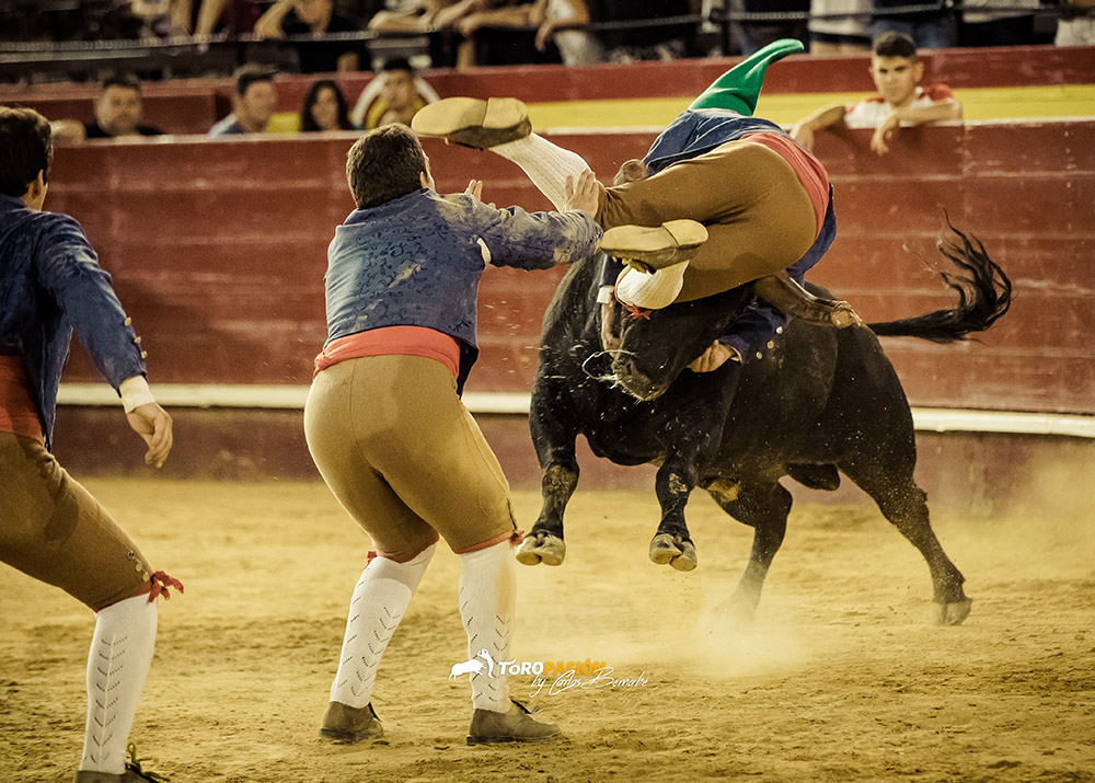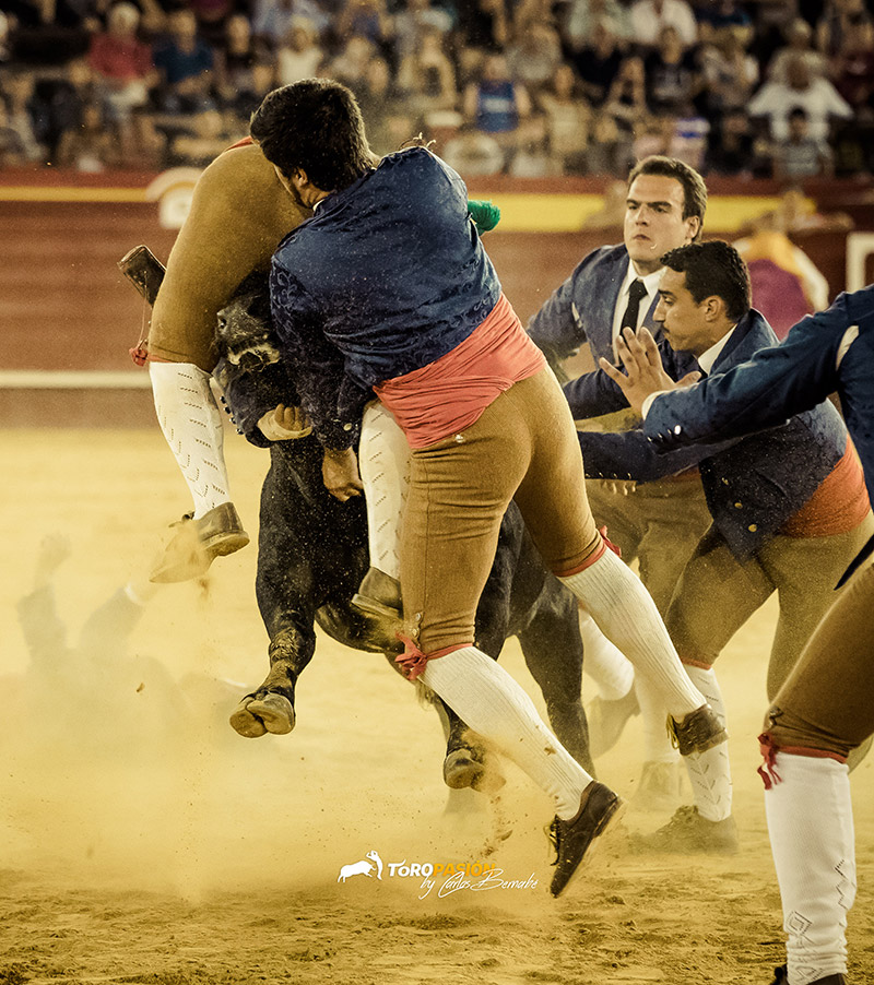 Ante un extraordinario toro de Fernando Pereira Palha, llegó el turno de la exhibición de recorte libre. Los cinco encargados de la misma, no se dejaron nada en casa, y levantaron al público de sus asientos. Tanto ‘El Peque’, como Andrés Civera pusieron rodilla en tierra para quebrar a su oponente. Cristian Blanco volvió a sentirse a gusto delante de un toro, y le recetó dos espectaculares quiebros. El valenciano Rober, pegó un milimétrico recorte y demostró su potencia física con sus saltos. Y a ‘Use’ se le vio en su salsa, recortando y saltando al de Palha en numerosas ocasiones. El toro sin embargo no se lo puso nada fácil a los forcados. Mandó a alguno de ellos a la enfermería, pero no se dieron por vencidos y finalmente se hicieron con él, en un auténtico derroche de raza.