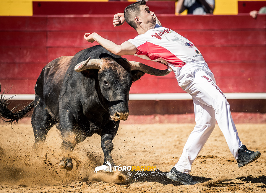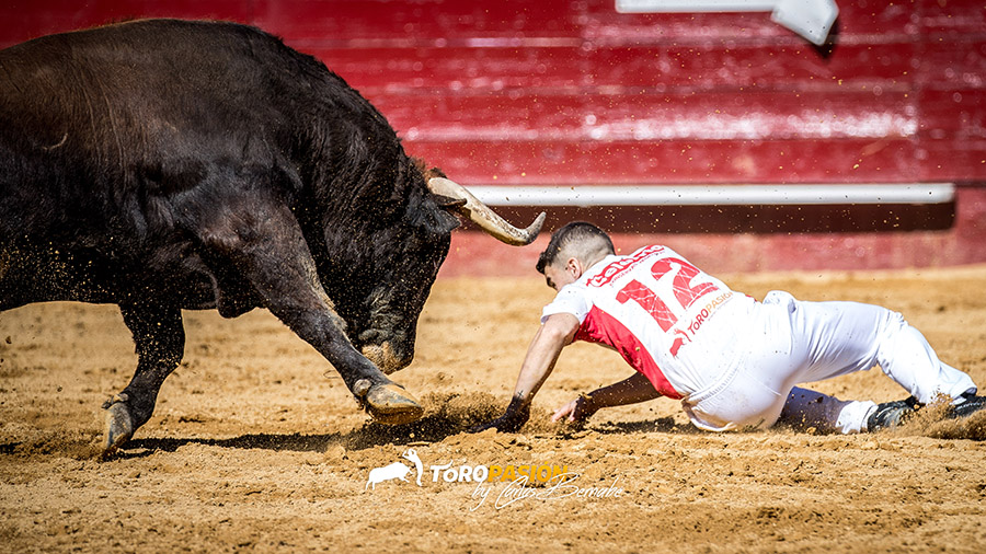 A la puerta de toriles se fue Alberto Ciudad para realizar un tirabuzón a portagayola, y sorprendió con otro salto al hilo de las tablas ante un toro muy ancho de sienes y muy cambiante en sus embestidas. Apostó también “Moi” por este salto, pasando muy cerca de los lomos del animal. Adrián Lambas estuvo muy sereno, y le hizo con mucha suavidad los tres recortes. Y “Zorrillo” fue quizás quien mejor entendió al segundo de la mañana, cortando con la puerta de toriles a sus espaldas. Destacó su segunda suerte, dándole toda la ventaja al animal.