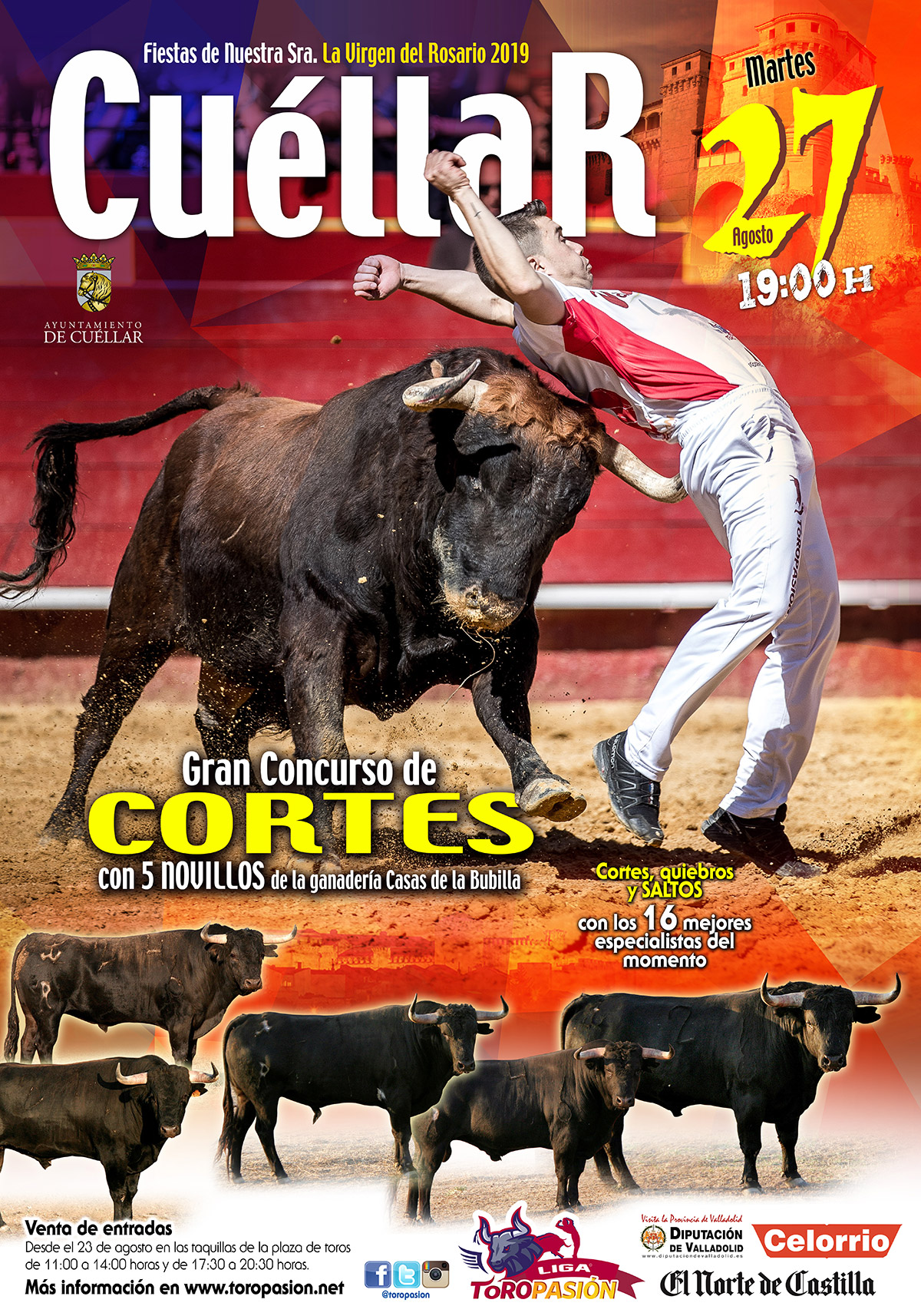 La villa de Cuéllar acogerá a los mejores cortadores, quebradores y saltadores de España en la tarde del 27 de mayo en el tradicional concurso de cortes que, en esta ocasión, contará con la gestión de la empresa líder en España en festejos populares, Toropasión. Desde el consistorio de Cuéllar se ha hecho una apuesta importante por relanzar este festejo y consolidarlo entre los concursos de cortes referentes de nuestro país. Toropasión es la empresa encargada de la organización del Campeonato de España o la Liga del Corte Puro, los dos campeonatos de toreo a cuerpo limpio más importantes del mundo.