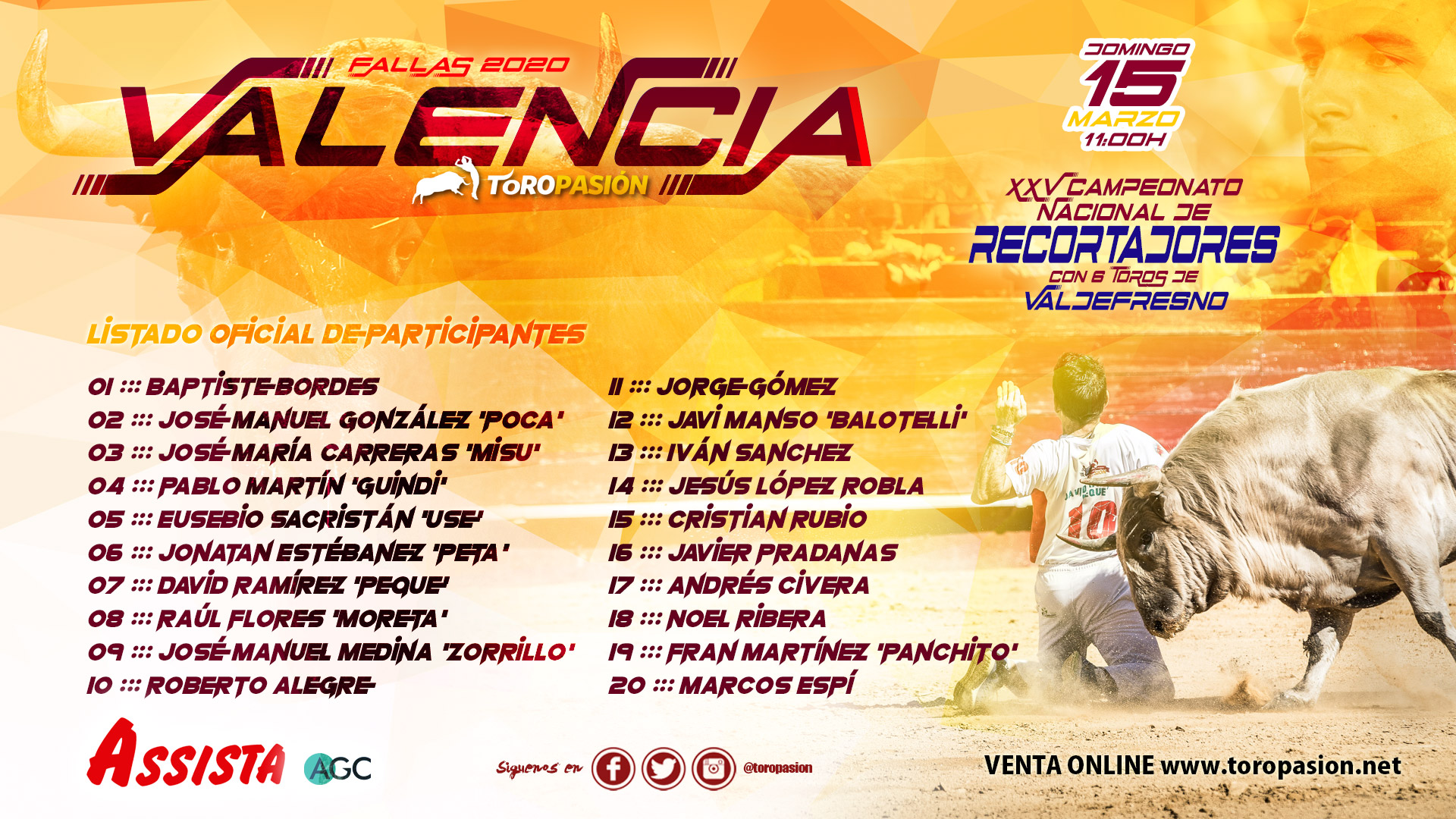 La mañana del domingo 15 de marzo, como es habitual, será el turno de los mejores recortadores de nuestro país, en el XXV Campeonato Nacional de Recortes que contará con los espectaculares toros de la ganadería salmantina de Valdefresno. 20 elegidos especialistas, con una amplia representación de valencianos, se verán las caras ante una seria corrida de toros de encaste Atanasio perteneciente al hierro de Valdefresno. Toros con cuajo, volumen y pitones para uno de los concursos de recortadores más importantes de nuestro país.