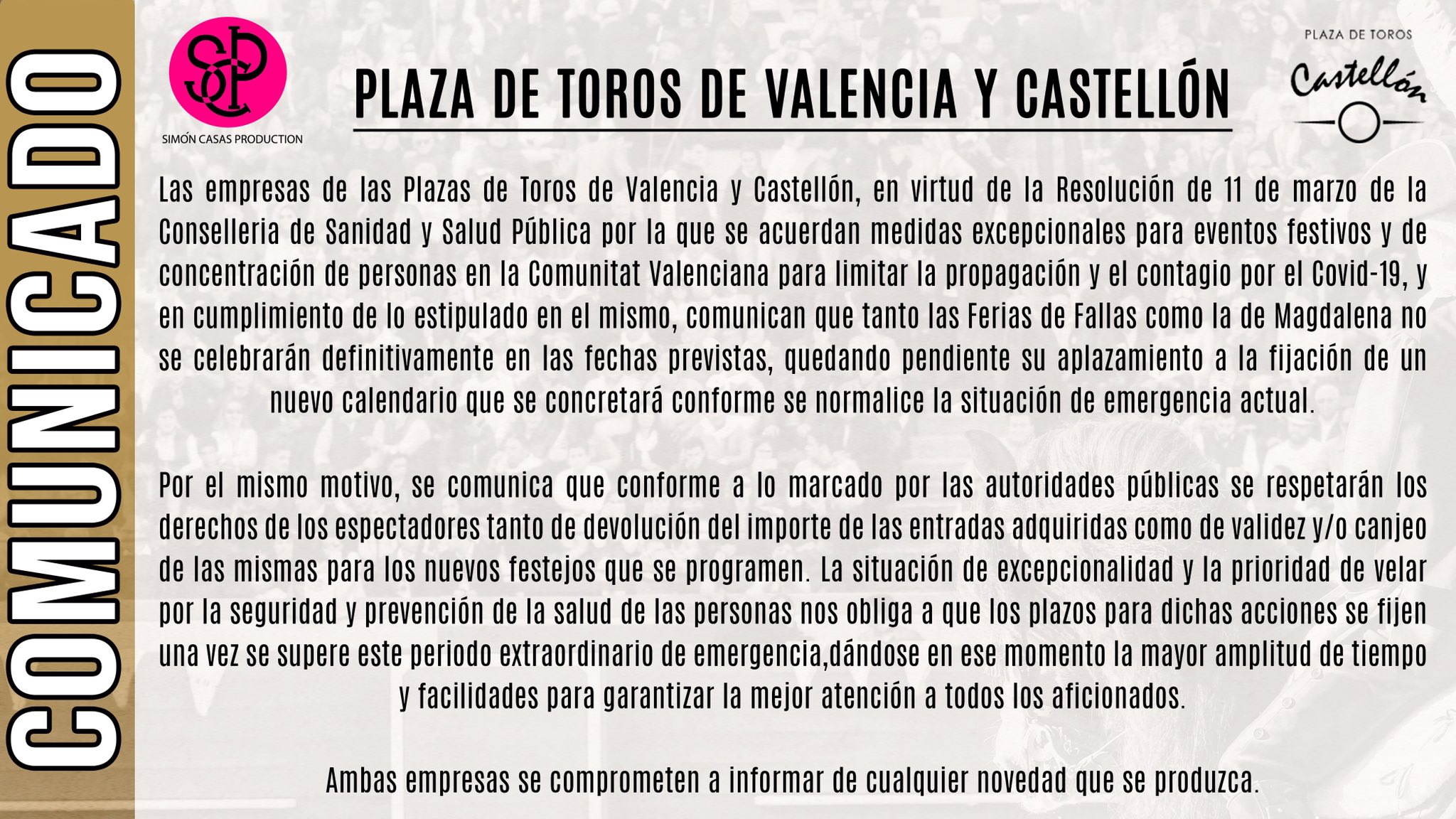 Las empresas de las Plazas de Toros de Valencia y Castellón en virtud de la Resolución de 11 de marzo de la Consellería de Sanidad y Salud Pública por la que se acuerdan medidas excepcionales para eventos festivos y de concentración de personas en la Comunitat Valenciana para limitar la propagación y el contagio por el Covid-19, y en cumplimiento de lo estipulado en el mismo, comunican que tanto las Ferias de Fallas como la de Magdalena no se celebrarán definitivamente en las fechas previstas, quedando pendiente su aplazamiento a la fijación de un nuevo calendario que se concretará conforme se normalice la situación de emergencia actual.