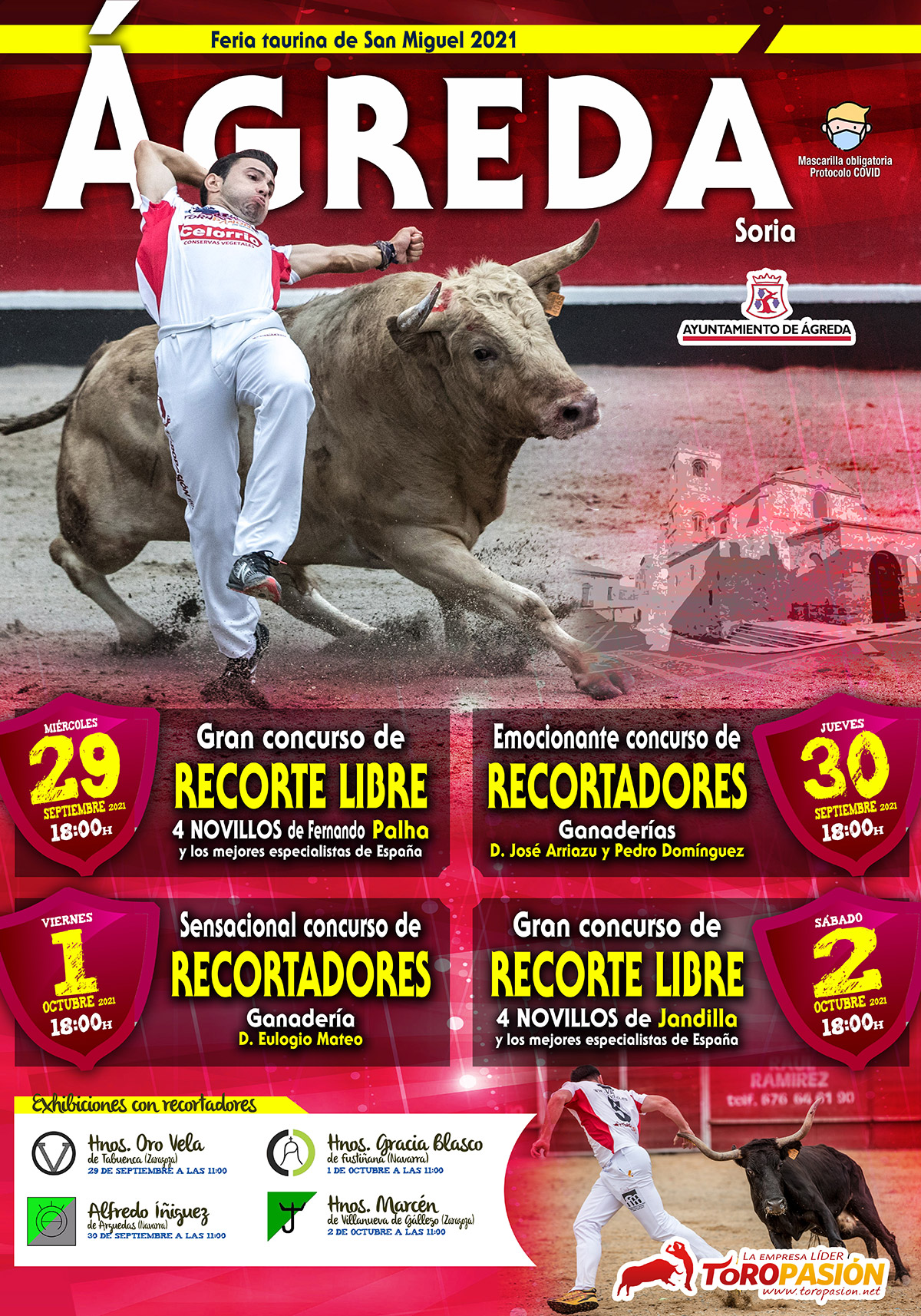 Las fiestas de San Miguel en Ágreda (Soria) volverán a contar con festejos taurinos como plato fuerte de las fiestas. Un ciclo que estará compuesto por 4 festejos populares de primer nivel durante los días 29 y 30 de septiembre, 1 y 2 de octubre. Estos eventos contarán con la presencia de los mejores recortadores de nuestro país en las distintas modalidades y también con la presencia de algunas de las ganaderías más prestigiosas de la cabaña brava española y del festejo popular. En la modalidad de recorte libre protagonizarán el apartado ganadero los famosos hierros de D. Fernando Pereira Palha (miércoles 29 de septiembre), conocido por sus reses vazqueñas de espectacular pelaje y la prestigiosa vacada de Jandilla (sábado 2 de octubre), de origen Domecq y una de las ganaderías más cotizadas por las figuras del toreo.