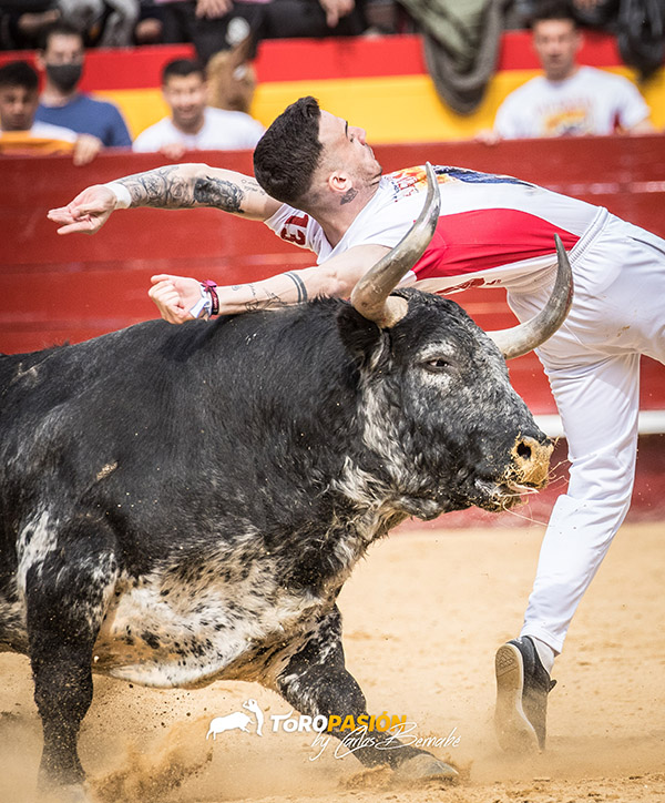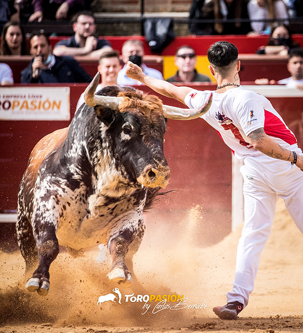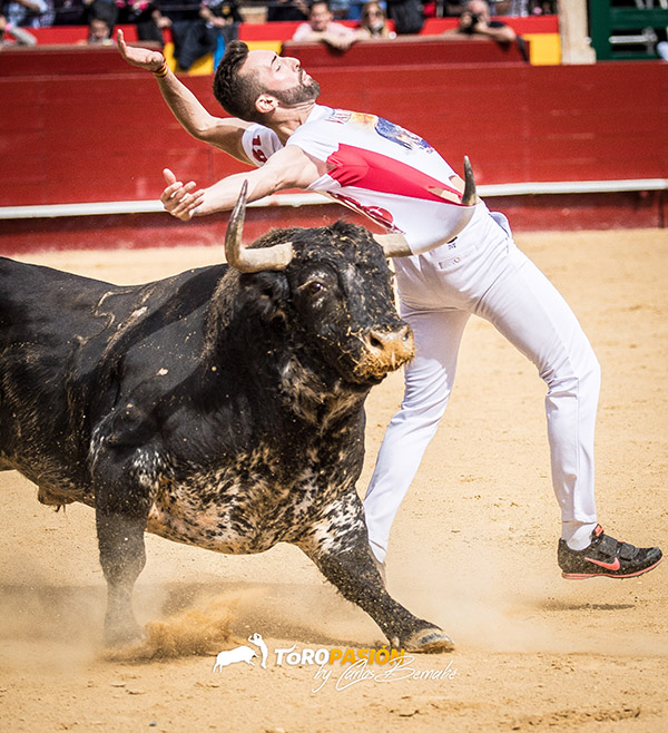 Dicen que la ilusión no entiende de la edad. Y buena prueba de ello es que David Ramírez «El Peque» a sus 47 años y más de media vida en el mundo del recorte, se fue de rodillas a porta gayola. No pudo ser, ya que «Diácono» el precioso toro sardo que estaba reseñado en segundo lugar salió muy parado. Tuvo que optar por el recorte en la primera suerte, pero no quiso dejarse nada en el tintero y al final pudo recetarle un buen quiebro de rodillas en el tercio. Cerró actuación con un recorte aprovechando las embestidas del toro, pero no pudo ser del todo lucido. Cristian Moras dio tres buenos recortes por el izquierdo; pitón por el que sabía lo que se dejaba el de Peñajara y por ello su actuación fue de menos a más. En tercer lugar llegaba Pablo Clavijo, que se puso en los medios en su presentación en Valencia, pero el toro rompió en el último momento y se desplazó demasiado al quiebro. En sus dos suertes restantes, cambió de terrenos el alicantino y ahí pudo medir mejor al toro. Cerraba el segundo grupo Javi Manso «Balotelli», que realizó de primeras un buen recorte por el derecho. Le consintió mucho en los otros dos y se puso en un sitio muy comprometido para ceñirse al máximo el pitón. Gran actuación del segoviano.