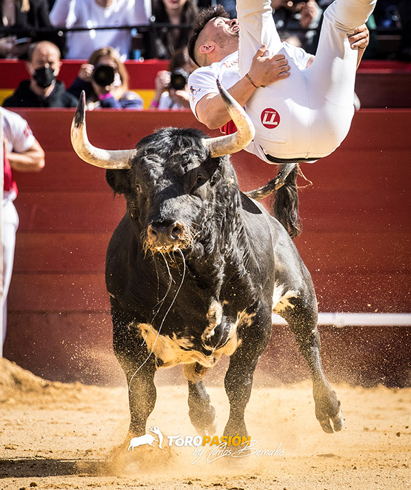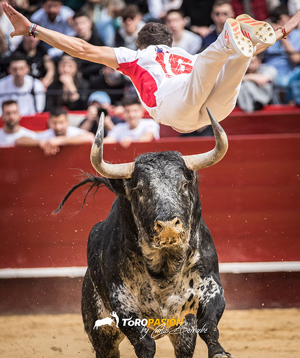 Raúl Sáez «Rampeta» empezó con un buen salto mortal, un vistoso barani y finalizó con otro bonito tirabuzón. Salió a corazón abierto el valenciano Raúl Moreta en su plaza y dio un quiebro de los que quedan en la memoria de todos los presentes en el coso de la calle Xátiva. Aguantó hasta el último momento, apenas marcó y el toro pasó arrancándole la camiseta. Volvió a ponerse en los medios en el segundo, y su tercer quiebro finalizó como nadie quería. Llegó la crudeza y la verdad del festejo popular. Tiró la moneda al aire y salió a jugarse la vida el de El Puig. Marcó de nuevo por el pitón derecho para pegárselo de verdad, y el toro le alcanzó de manera muy violenta, teniendo que pasar a la enfermería. No pudo ser en este año, pero ahí sigue su plaza y Moreta terminará conquistándola con su temple.