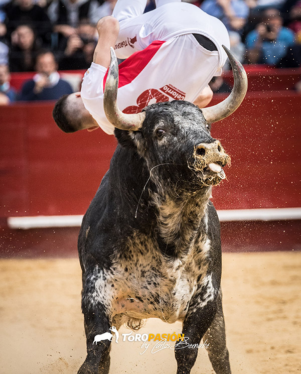 Tremendamente serio era el primer toro de Peñajara, al que Aarón Grande recibió en los medios tragando paquete ante las primeras inciertas embestidas del animal. Muy meritorio fue su segundo quiebro, en el que tuvo que ponerlo todo el navarro, yendo de tú a tú a por el burel; al igual que en la tercera ronda en la que cambió a última hora el pitón para desplazarlo. Eusebio Sacristán se presentó en Valencia con un espectacular tirabuzón, en la que el toro le echó la cara muy arriba. Le rozó la camiseta al recorte en su espectacular segunda ronda, y realizó su salto marca de la casa, pasando por encima de los lomos sin apenas espacio. Andrés Civera se despedía de los ruedos, y lo hizo con dos saltos del ángel, y un recorte. No pudo irse con buen sabor de boca el de Sagunto en su último paseíllo, aunque este día siempre quedará grabado en su corazón. El valenciano Marcos Espí siguió el mismo guión y empezó con un estético salto del ángel y dos buenos recortes dejándoselo por delante.
