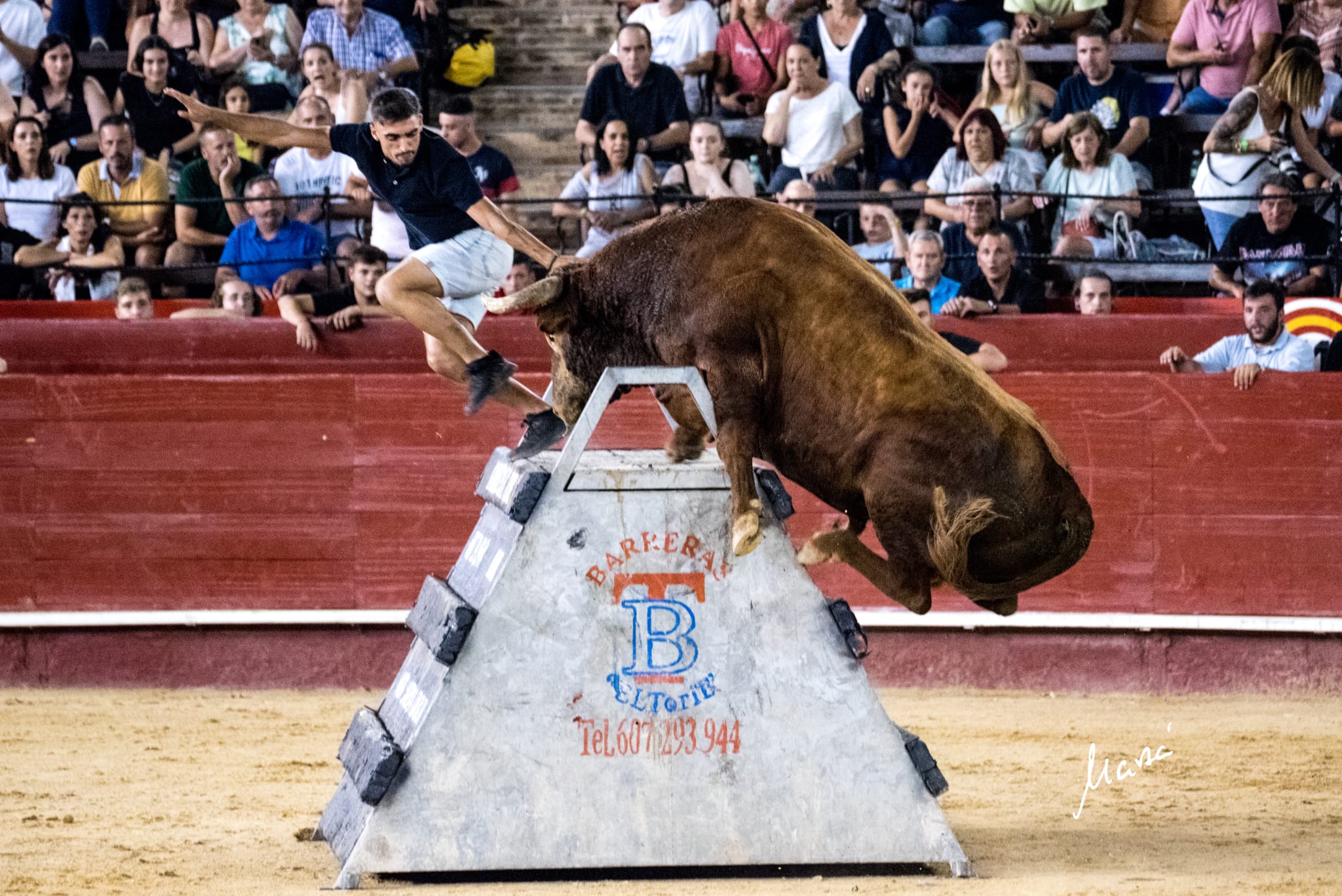 De la mano de Toropasión, llegaban los de Arriazu a Valencia generando mucha expectación, pero no fue hasta la salida del nº 4 «Repartidor II» cuando llegó esa emoción que había faltado en los primeros compases de la noche. El capón de Arriazu realizó varios saltos al callejón y acudió con codicia a los cites, destacando un buen quiebro de Sergio ‘Wida’. Seguidamente salió llegaba el turno del toro «Fugitivo», que dejó grandes detalles, echando siempre la cara arriba con gran violencia en las tablas. El rodador Kevin ‘Látigo’ de Villarreal estuvo muy activo durante la noche, recibiendo en la puerta de toriles a varios de los capones, entre ellos a «Laborioso», que trabajó bien todos los obstáculos. «Friolero» generó los momentos más tensos de la noche, con dos espectaculares saltos al callejón tras ‘Látigo’ y ‘Chin-Chan’, en los que estuvo a punto de llegar a los tendidos. En penúltimo lugar salió al ruedo el toro «Lastimoso» que hizo una buena subida a la pirámide y al que Javier Hernándiz saltó al tirabuzón en dos ocasiones. La noche acabó con emociones fuertes gracias al impresionante capón «Repartidor», que saltó tras Pablo Rodri alcanzando las cuerdas de las localidades de barrera y dejando esa sensación de peligro que buscaba el público que poblaba los tendidos de Valencia. Antes de la entrega de premios en metálico con los que la empresa Toropasión quiso premiar a los más valientes de la velada, se tributó una merecida ovación a los ganaderos de José Arriazu.