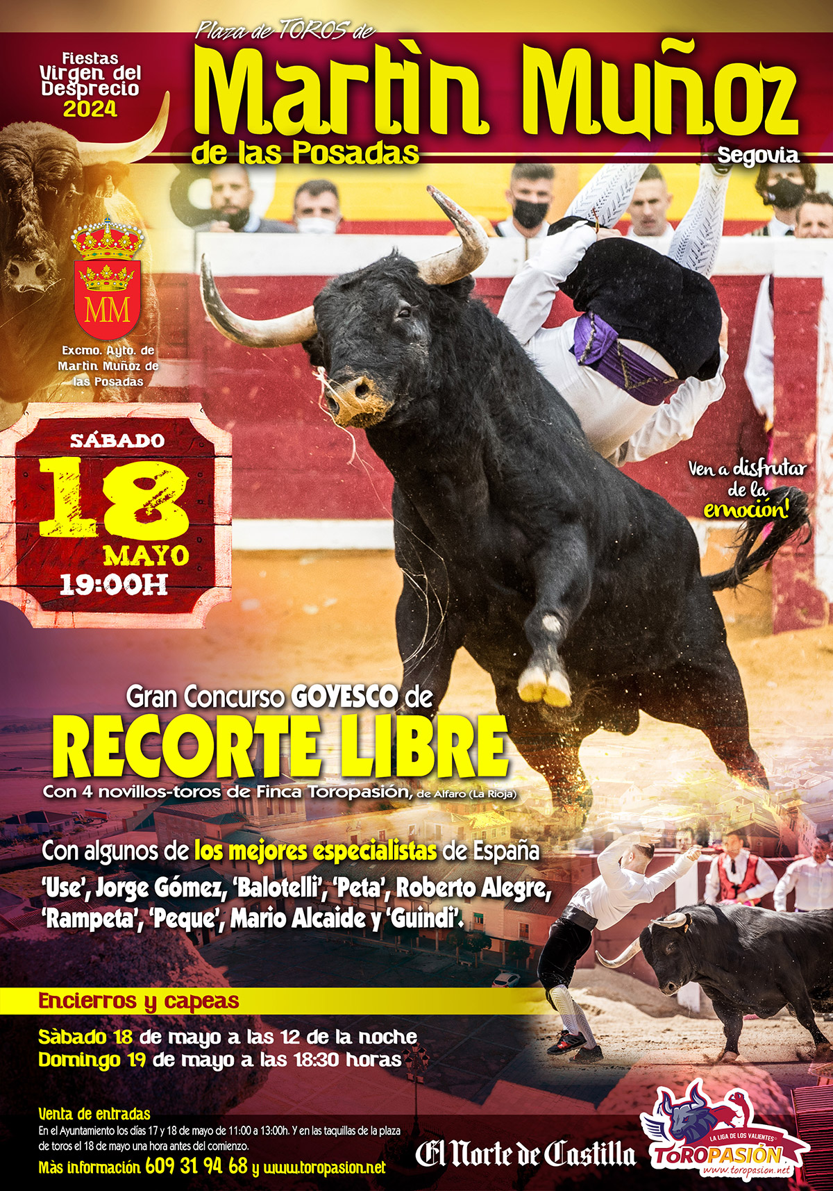 La localidad segoviana de Martín Muñoz de las Posadas vive este fin de semana sus fiestas en honor a Nuestra Señora la Virgen del Desprecio y con ellas llegan los esperados festejos taurinos que tendrán como plato fuerte el concurso de recortadores con novillos-toros del sábado 18 de mayo en horario vespertino (19:00h). Un concurso que contará con la presencia de 9 de los mejores especialistas de España en el arte de enfrentarse a cuerpo limpio al toro y que se llevará a cabo en la modalidad de Goyesco.