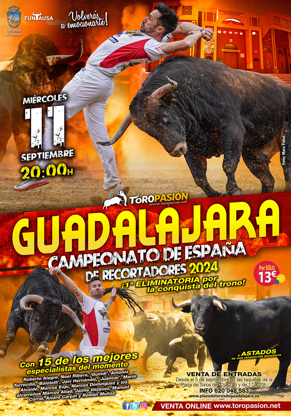 El prestigioso Campeonato de España de recortadores regresa, tras el éxito de los últimos años, a Guadalajara con motivo de sus fiestas de la Virgen de la Antigua en la tarde del miércoles 11 de septiembre (20:00h). Este certamen, que cuenta con la gestión de la empresa líder Toropasión, reunirá a 15 de los mejores recortadores, quebradores y saltadores de España y con una nutrida representación de especialistas de Castilla La Mancha. El certamen aterriza en Guadalajara para llenar de emoción sus gradas, con un elenco de especialistas de primer nivel. Las fases de clasificación de este certamen recorrerán las plazas de toros de Guadalajara y Las Ventas (6 de octubre) mientras que la semifinal se desplazará hasta Valencia (9 de octubre) y la gran final tendrá lugar en Castellón (3 de noviembre).