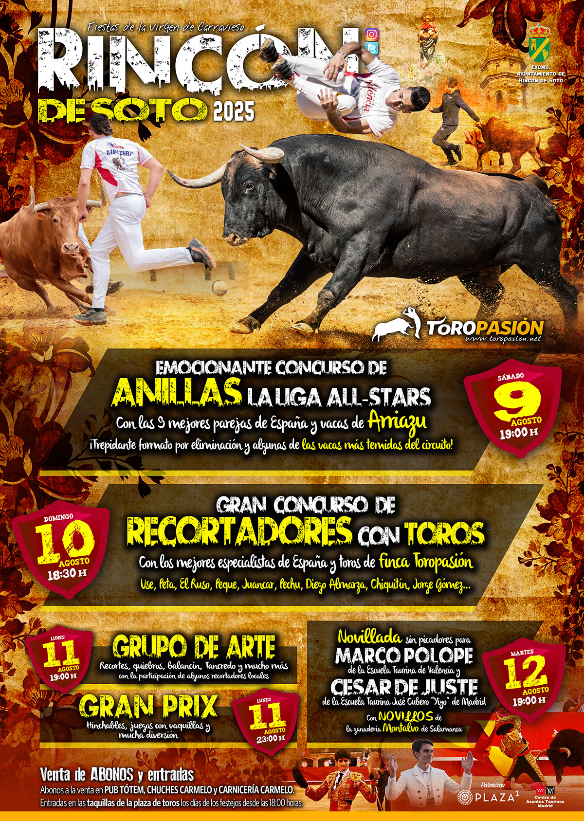 Las fiestas en honor a la Virgen de Carravieso contarán este año con un completo programa de festejos taurinos organizado por el Ayuntamiento de Rincón de Soto y la prestigiosa firma Toropasión. Del 9 al 12 de agosto, la plaza de toros local será escenario de emocionantes concursos y espectáculos que reunirán a algunos de los mejores especialistas del panorama nacional.