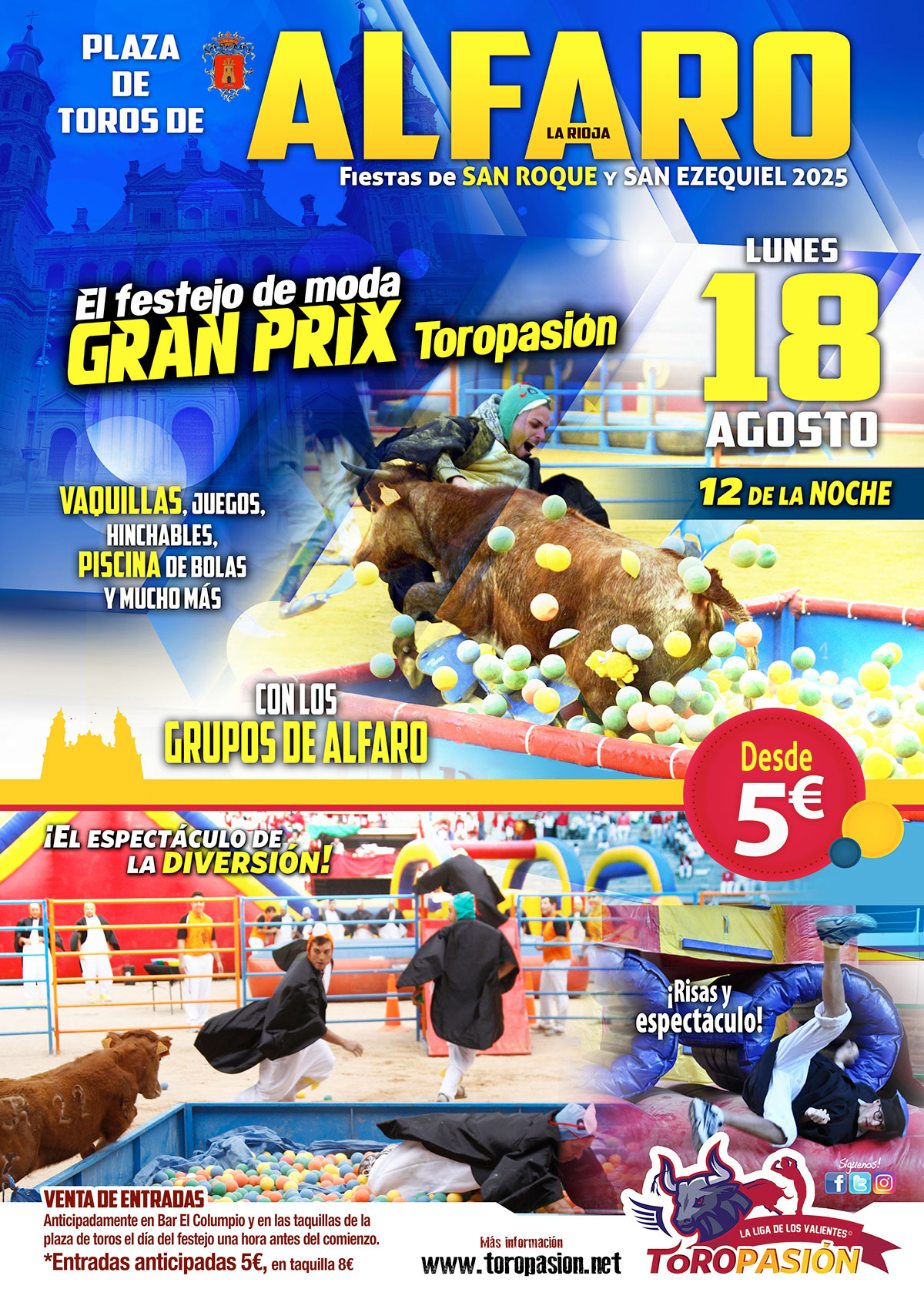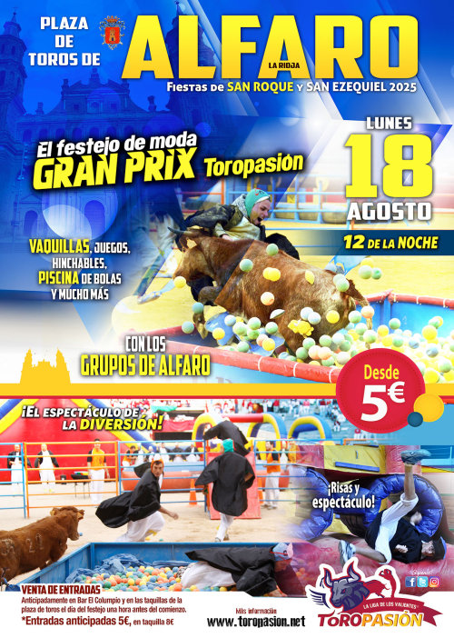 Las fiestas de San Roque y San Ezequiel en Alfaro (La Rioja) esperan con ganas uno de los actos más divertidos y emocionantes de todas las fiestas, el súper Gran Prix Toropasión. Un espectáculo, que resulta todo un éxito todos los años, y que llenará de color la noche taurina del lunes 18 de agosto (12 de la noche). Este festejo contará con varias cuadrillas de jóvenes de Alfaro que tendrán que superar las embestidas de las vaquillas en los diferentes juegos y circuitos dispuestos en el ruedo. Los equipos lucharán a lo largo de 2 horas de pruebas con hinchables, piscina de bolas, pista americana y mucho más para proclamarse vencedores de este gran prix que ha levantado mucha expectación.
