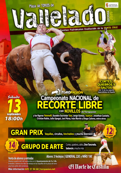 El plato fuerte será el Campeonato Nacional de Recorte Libre, que tendrá lugar el sábado 13 de septiembre a las 18:00 horas, donde 12 de los mejores especialistas de España se medirán a los novillos de Toropasión en una cita que combinará cortes, quiebros y saltos de máxima espectacularidad.